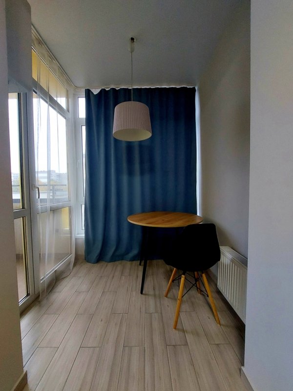 Площадь 40м2, спланирована как кухня - студия и отдельная спальня, санузел, балкон с панорамным остеклением и есть открытый балкон.
