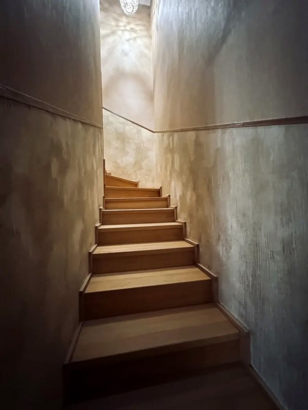 Площадь 140 м2, расположена на трех уровнях: