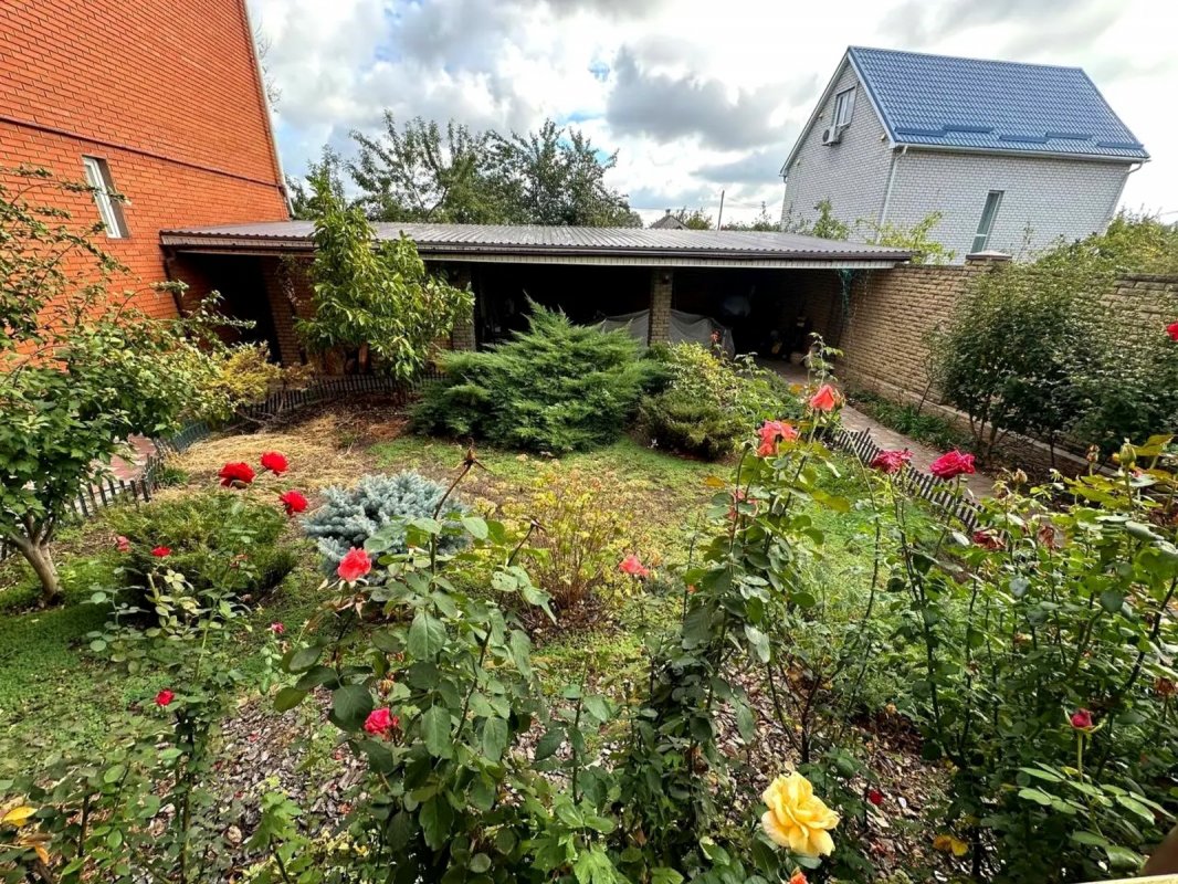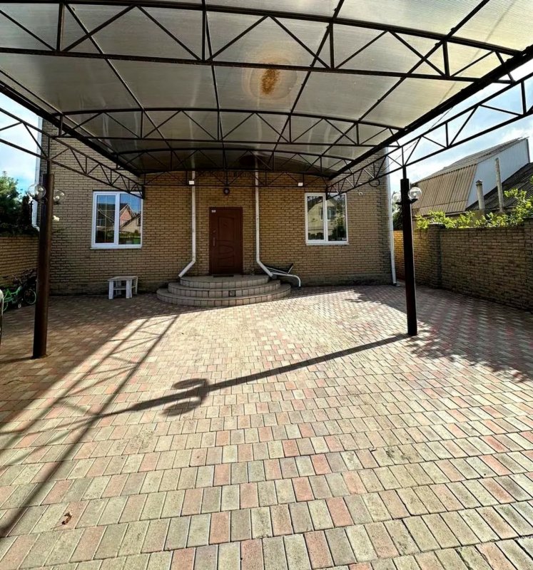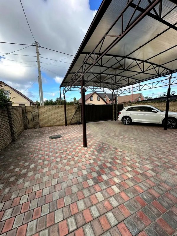 Ровный приватизированный участок 5 соток, по периметру капитальный забор из кирпича, автоматические ворота, сигнализация. Парковка на 5 автомобилей под навесом. На заднем дворе есть хозяйственная постройка.